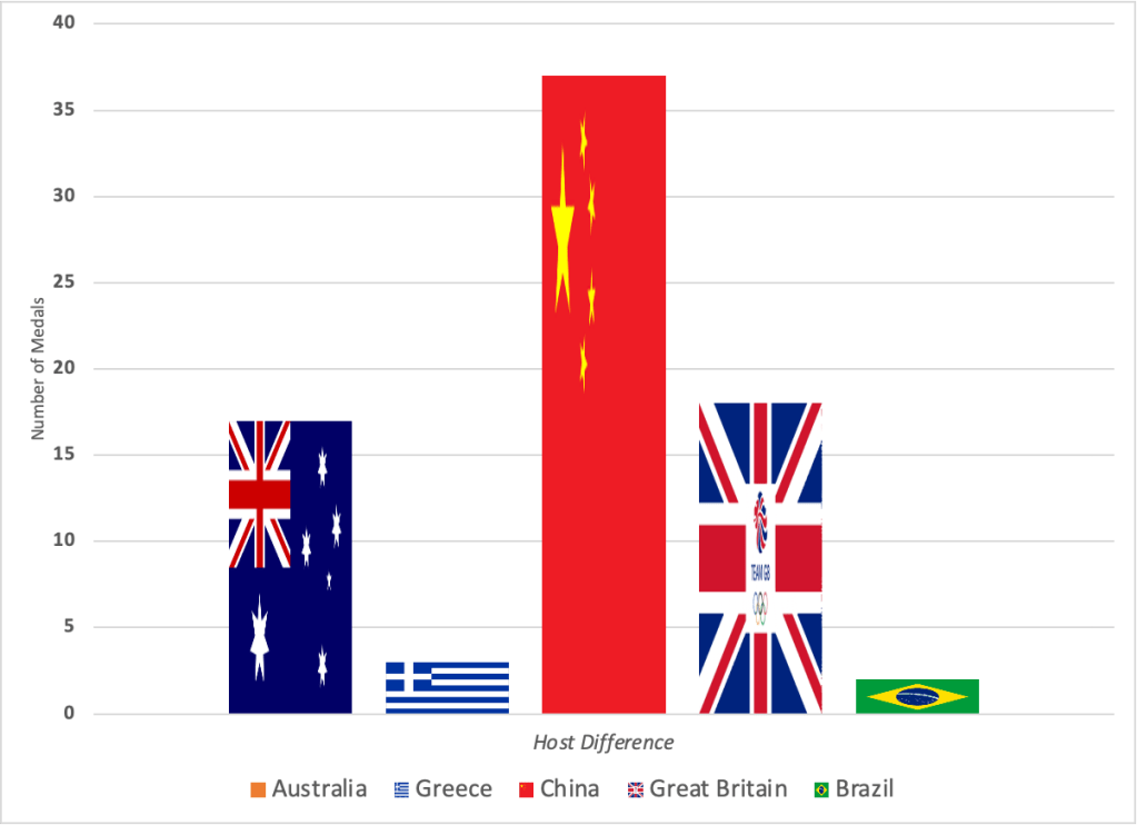 Historically, home nations have benefitted from the Olympics at home by winning more medals than the previous editions. In the last twenty years in particular, the trend has been quite clear with Greece and Brazil showing a minimal ‘gain’ from hosting the games and Australia, Great Britain and China making huge improvements (with GB being the only nation to surpass home games success in Rio 2016).