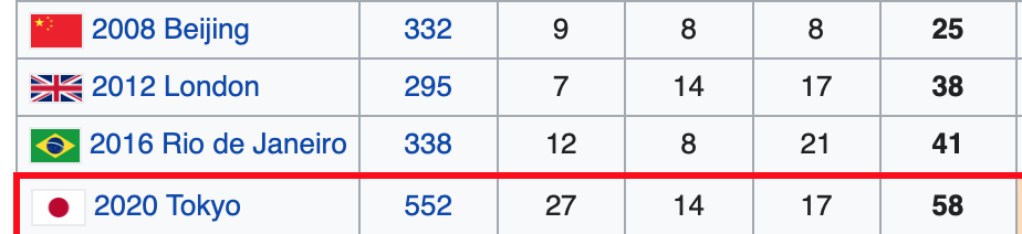 There were high expectations for Japan, due to the announced ambition of the host nation of a target of 30 Gold medals made in 2019 (one year before the original dates). The host nation boost has been well reported over the years and it is expected for a host nation to win more medals than in previous games. You can read an interesting article on The Washington Post here, and see all the data about medals of previous host nations. Few nations seem to be able to be consistently on the ‘up’ on the medal table at the moment, with Japan being one of them and NZ with a consistent growth. Important to note the fact that Team GB seems to be holding well from hosting the games in 2012 and possibly being the only nation to maintain similar leve of performance 2 editions after the home games (more on that later).