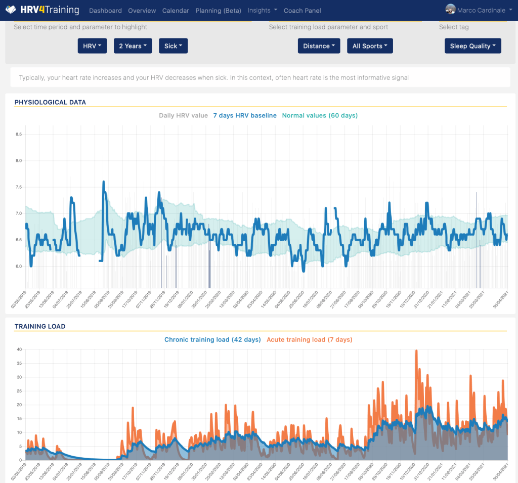 I have tracked morning Heart Rate data for a number of years now, and can say that for me it is a way to track training and non training stress very well. Alterations in morning Heart Rate and HRV indices are affected by many factors, however form my own personal experience, I know that when HR is high and RMSSD is low, there is something brewing and I need to put the foot off the pedal. In 2017, Xiao Li and her colleagues at the Snyder Lab at Stanford University published a paper showing that tracking heart rate among other physiological signals in daily life can give warning of sickness onset. It’s a great paper, based on a careful examination of data from over 250,000 daily measurements among 43 people. Fascinating paper which shows how, thanks to technology, we are moving towards the ability to be able to truly personalise health and training interventions also form remote by having relevant data to use. There are now a number of studies recruiting individuals worldwide to share their wearable data to understand more about flu and COVID-19 symptoms. One of them is here https://quantifiedflu.org and it is using data from a number of wearable technology. If you are interested, have a look at the page and take part!